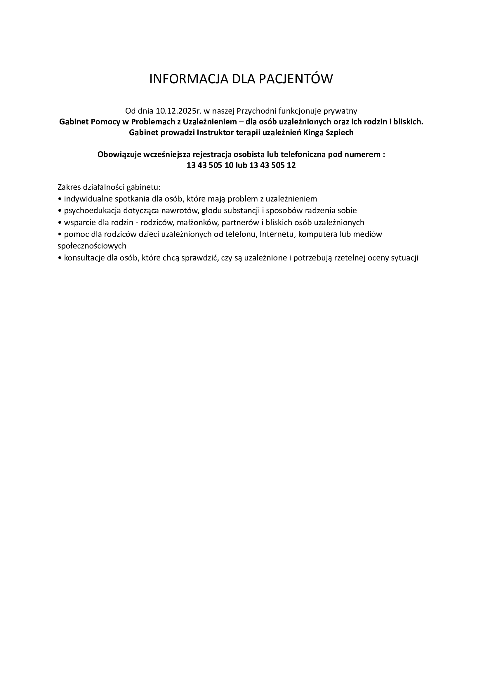 Informacja o Prywatnym Gabinecie Pomocy w problemach z uzależnieniem – [pobierz]