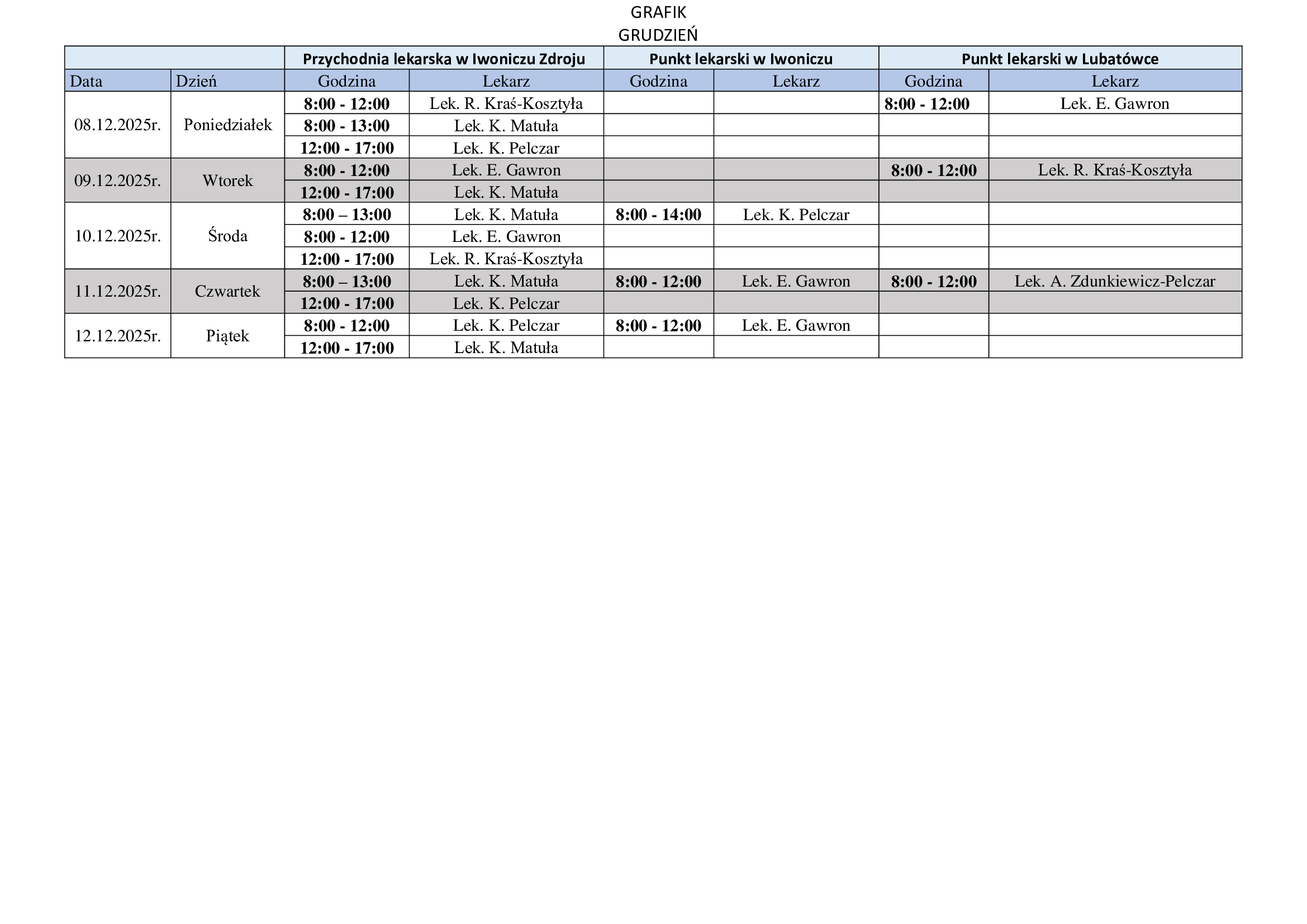 HARMONOGRAM PRACY LEKARZY PRACUJĄCYCH W POZ IWONICZ- ZDRÓJ
